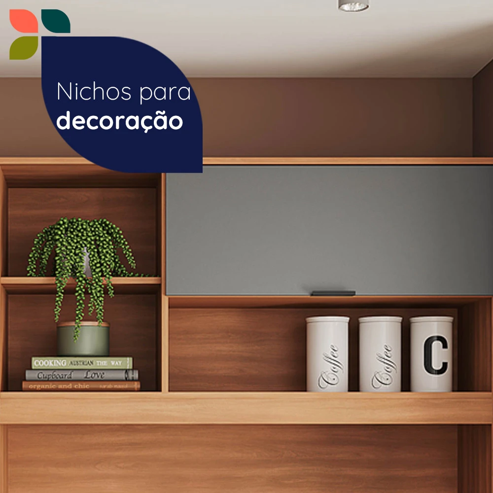 Amplo Espaço Interno: 8 portas, 3 prateleiras, 1 porta basculante, 2 gavetas, nichos para decoração, oferecendo espaço de sobra para organizar seus utensílios.