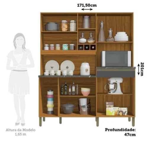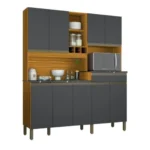Com 9 portas, gaveta espaçosa com corrediças telescópicas, você terá amplo espaço para seus utensílios. O tampo de 15mm com moldura adiciona requinte, enquanto os pés reguláveis em ABS garantem estabilidade. Além disso, conta com espaço para micro-ondas e adega, otimizando ainda mais o espaço da sua cozinha. Fabricada em 100% MDF com pintura UV, garante resistência e longa durabilidade.