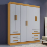 O Roupeiro da Rei Moveis possui 6 portas 6 gavetas e puxadores de madeira.