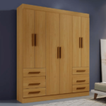 O Roupeiro da Rei Moveis possui 4 portas 3 gavetas e puxadores de madeira.